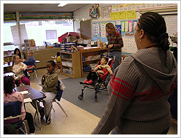 今度は長女のKinderです。運転免許試験場で会ったご婦人に頂いた名刺を頼りに、小学校に電話をしました。紹介してもらったGinsberg先生とお話することができましたが、彼女が既に連絡してくれていたようで、こちらの事情もほとんど分かってもらえていました。いつでも都合の良いときに学校に来てくださいと言われましたので、早速翌日にお邪魔することにしました。電話でしたが大変親切に対応して下さいましたので、娘を預ける心配が少し和らぎました。翌日家族で学校にお邪魔すると、そのGinsberg先生が出迎えて下さいました。大柄で髭面、あのタクシー運転手のような感じです。寒いからすぐに校舎に入るように言われ、校舎の中で自己紹介です。応接室に通されて驚いたのは、副校長、障害児を受け持つ教諭、理学療法士、作業療法士、看護師の皆さんが私たちを待っていて下さったことです。皆さんが私たちを歓迎してくれました。話をしているうちにCharlieが言っていたMadisonの教育水準が非常に高いということが実感できました。彼らは私たちに、どのような教育を望むのか、どのような事に気をつけなければならないか、経管栄養のケアをどうするか、日本でのリハビリはどうだったかなど質問して、非常に細かいことまでdiscussionしました。経管栄養のケアは家内が毎日学校に行って行うことになり、おむつ交換など経管栄養以外のケアや授業のアシストにはspecial teacherがマンツーマンで付いてくれること、学校までは車椅子ごと乗れるスクールバスで通学すること、家内は英語を話しませんので万が一の時には通訳が学校に来ることなど、いずれ日本に帰ってしまう外国人で、しかも重度の障害児に対してでも全て無償でやってくれるという、何とも信じられない大変ありがたい教育を受けられることになりました。